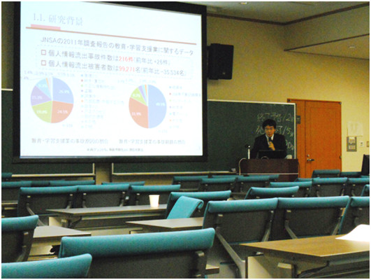 平成24年10月27日,信州大学工学部(長野県長野市)において,電子情報通信学会教育工学研究会が開催され,大学院情報工学専攻2年の上枝俊太さんにより「学校における個人情報流出事故対策のためのUSBメモリ貸出システム」という題目で研究発表が行われました.